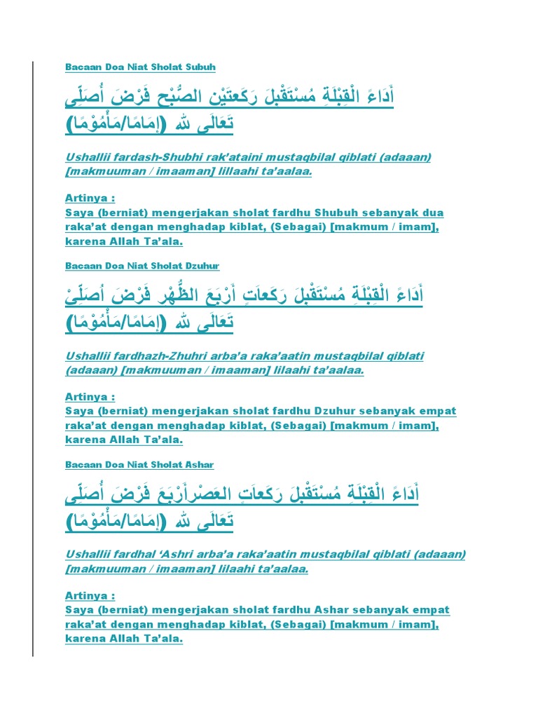 Yang mana dalam pembahasan kali ini mengenai tata cara bacaan niat sholat, rukun sholat, bacaan sholat bahasa arab latin dan terjemahnya dengan singkat dan jelas. Sholat 5 waktu hukumnya wajib sehingga setiap muslim diwajibkan untuk melaksanakan sholat. Lalu, bagaimana bacaan niat sholat 5 waktu tersebut? Jan 04, 2021 · lafadz niat solat 5 waktu secara berjamaah arab, dan keutamaanya. May 16, 2019 · niat sholat lima waktu: